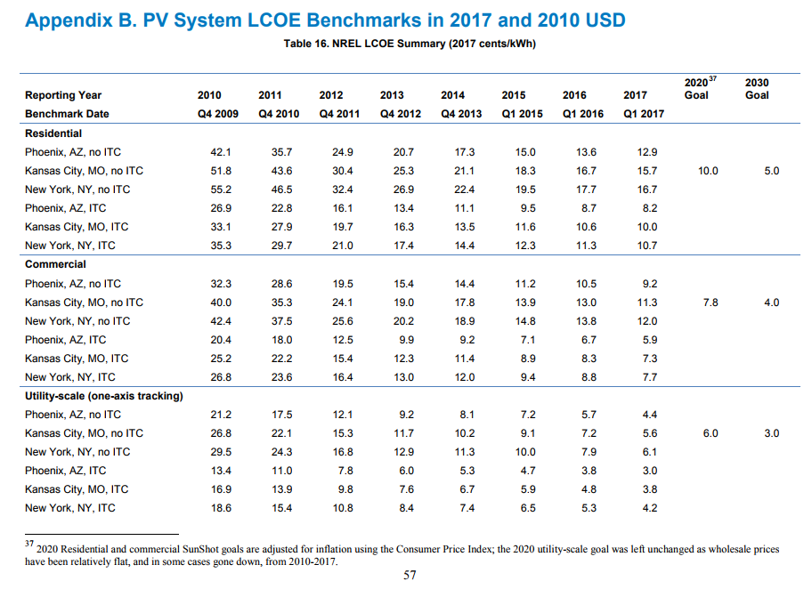 The appendix B summary is very useful, indicating that utility-scale generation is achieving $0.03-$0.06 $/kWh, depending on region of the US.