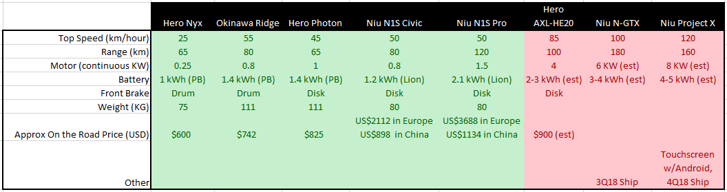 But this new announcement from Hero this month for the AXL-HE20, combined with EICMA announcement in late 2017 from Niu, mark a dramatic shift in the types of scooter we'll soon be seeing on the streets of India and China. Below is a table summarizing some key models, with green indicating shipping models and red indicating announced models.